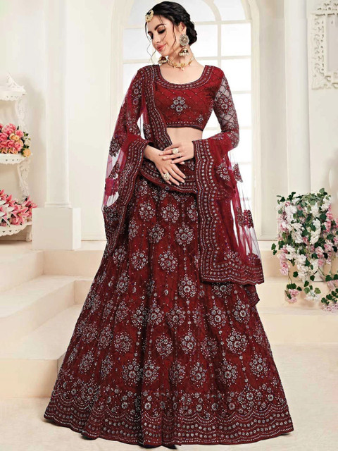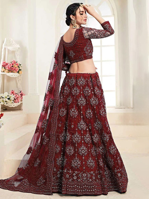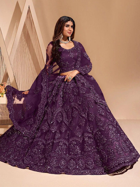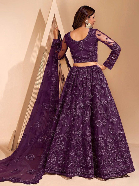 Purple embellished semi-stitched blouse, has a round neck, long sleeves, zip closure