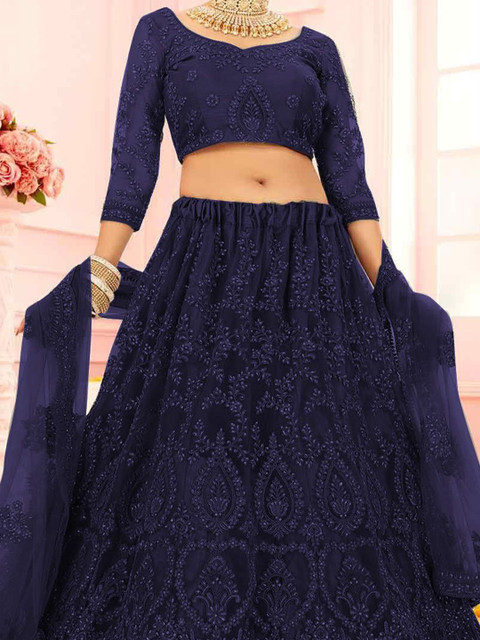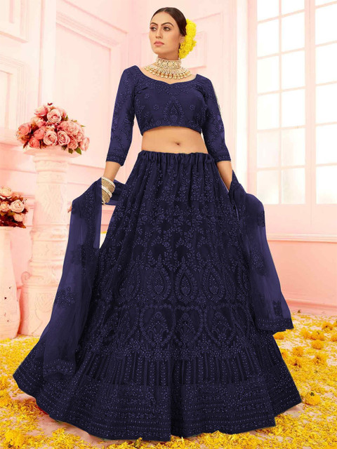 Multicoloured embellished semi-stitched blouse, has a round neck, long sleeves, multicoloured embellished semi-stitched lehenga, flared hem