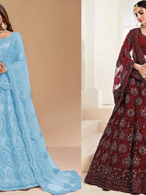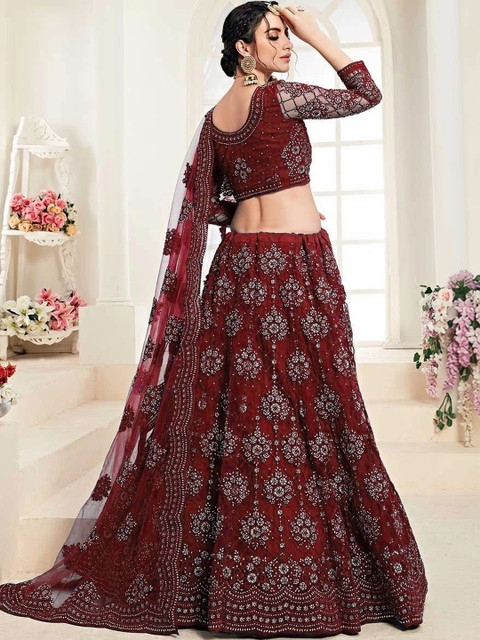 Maroon embellished semi-stitched blouse, has a round neck, long sleeves, zip closure