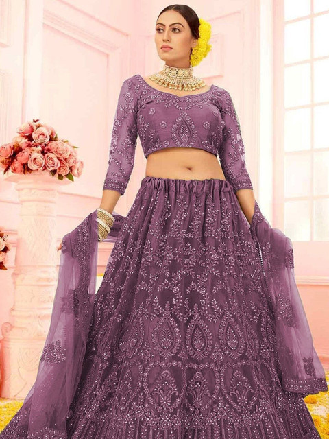 Purple embellished semi-stitched blouse, has a round neck, three-quarter sleeves, purple embellished semi-stitched lehenga, flared hem