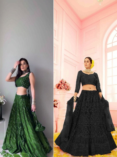 Green embellished semi-stitched lehenga, flared hem