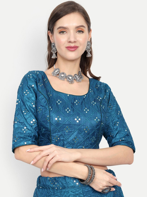 Blue embellished semi-stitched blouse, has a round neck, short sleeves, zip closure