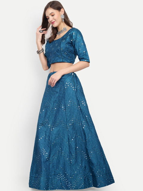 Blue embellished semi-stitched lehenga, has drawstring closure, flared hem