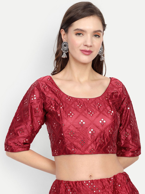 Maroon embellished semi-stitched blouse, has a round neck, three-quarter sleeves, maroon embellished semi-stitched lehenga, flared hem