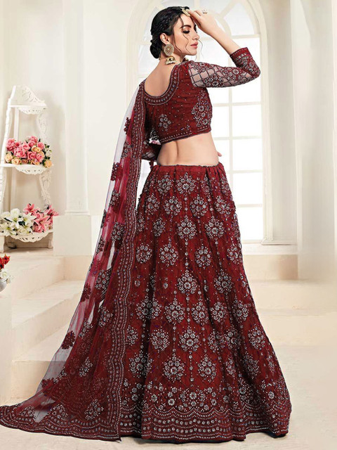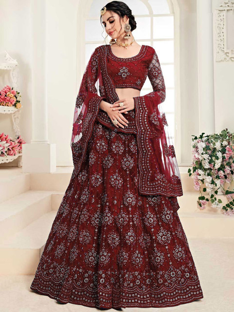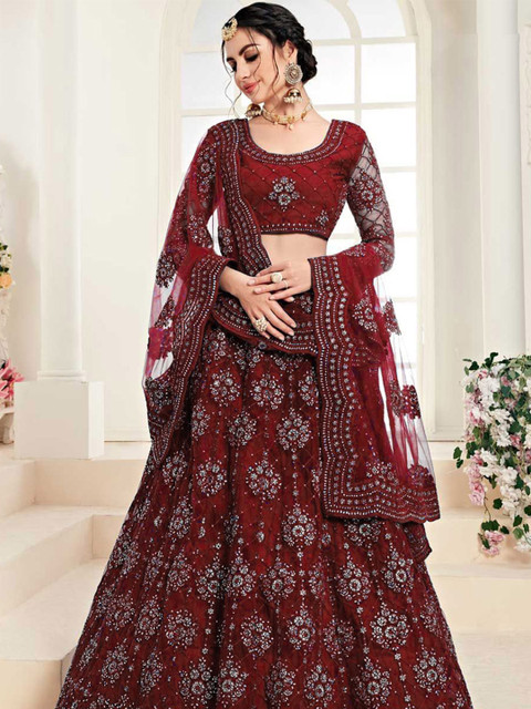 Purple embellished semi-stitched blouse, has a round neck, three-quarter sleeves, purple embellished semi-stitched lehenga, flared hem