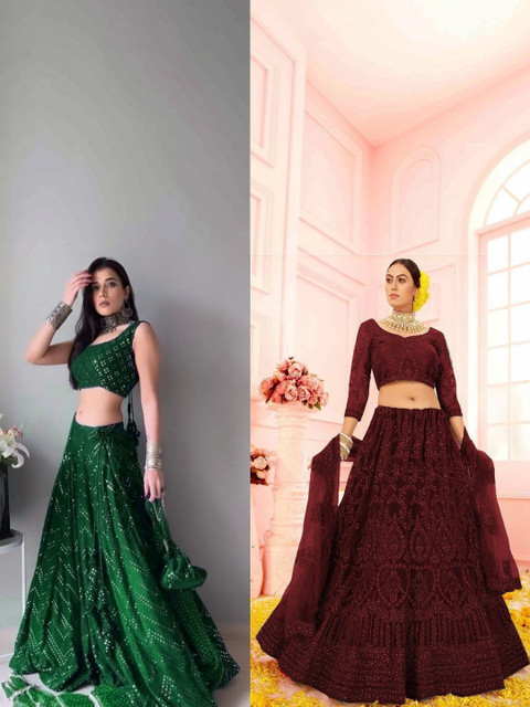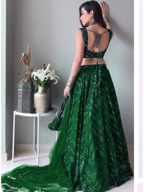 Green embellished lehenga choli with dupatta, has leheriya technique and sequinned