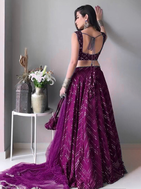 Purple and embellished unstitched blouse, has a round neck, sleeveless, purple embellished semi-stitched lehenga, flared hem