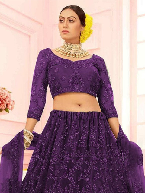 Multicoloured embellished unstitched blouse, has a round neck, three-quarter sleeves, multicoloured embellished semi-stitched lehenga, flared hem
