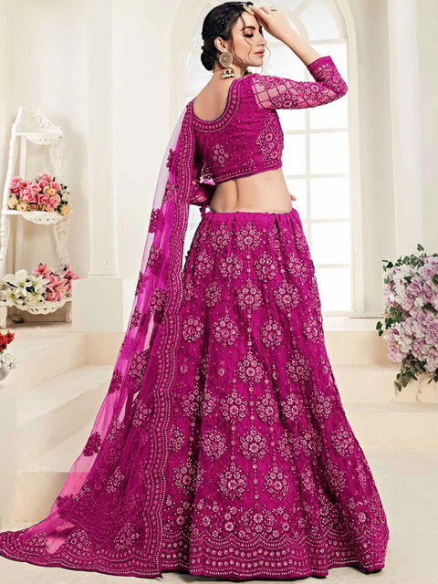 Purple embellished unstitched blouse, has a round neck, long sleeves, purple embellished semi-stitched lehenga, flared hem