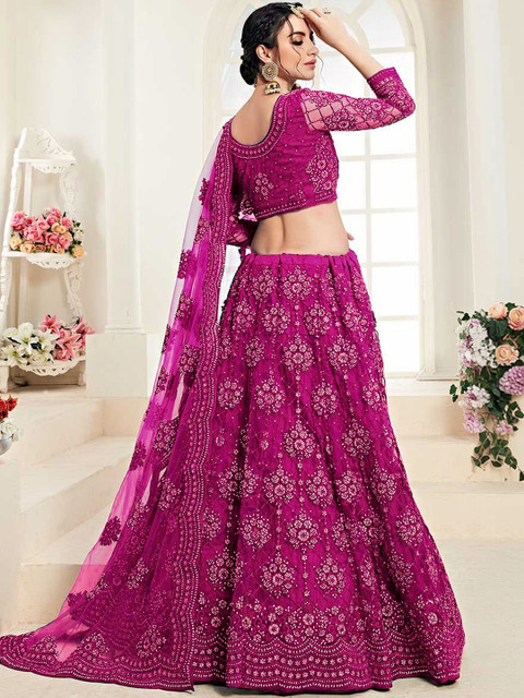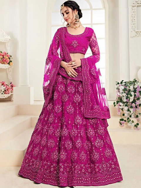 Multicoloured embroidered semi-stitched blouse, has a round neck, long sleeves, multicoloured embroidered semi-stitched lehenga, flared hem