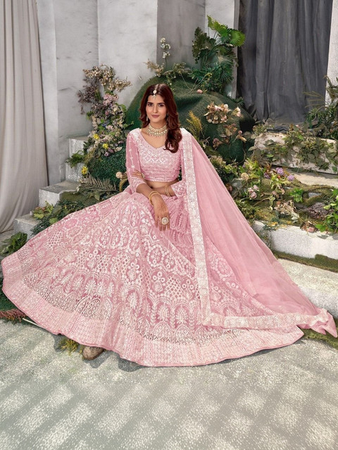 Pink embroidered semi-stitched lehenga, has drawstring closure, flared hem