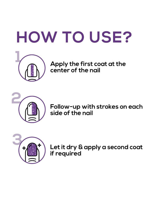 | How-to-Apply | Apply the first coat at the center of the nailFollow-up with strokes on each side of the nailLet it dry &, apply a second coat if required |