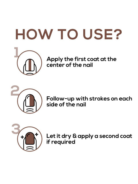 | How-to-Apply | Apply the first coat at the center of the nailFollow-up with strokes on each side of the nail.Let it dry &, apply a second coat if required. |