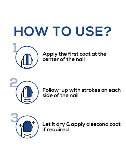 | How-to-Apply | Apply the first coat at the center of the nailFollow-up with strokes on each side of the nail. Let it dry &, apply a second coat if required. |