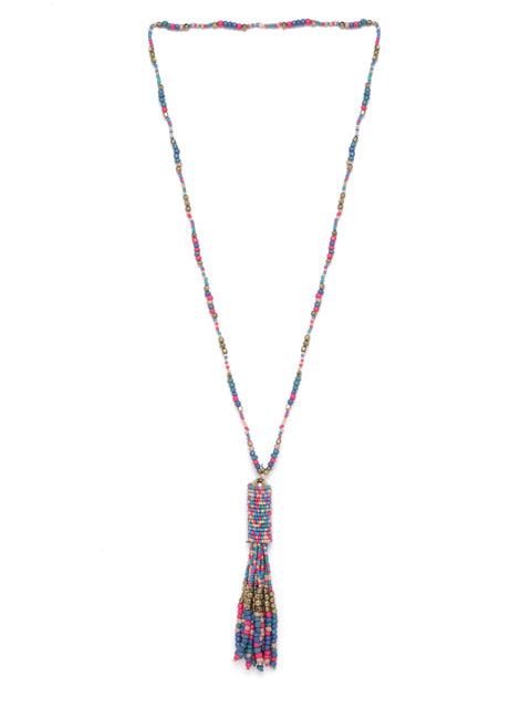 Blue and pink gold-p-lated beaded tasselled necklace