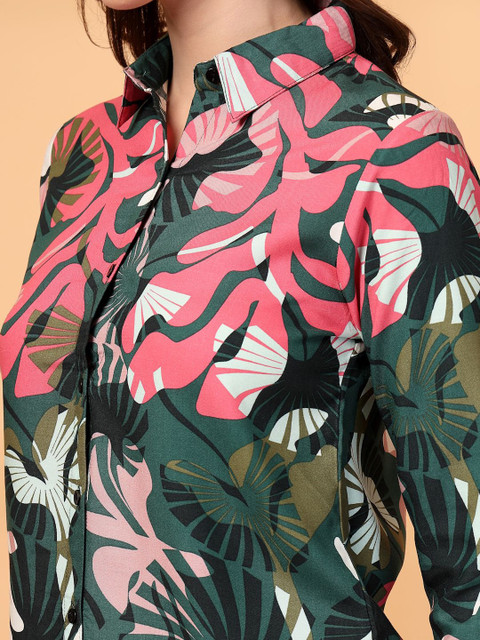 Green, pink and white printed shirt, has a shirt collar neck and long sleeves