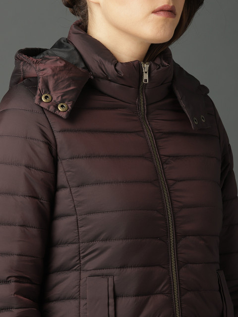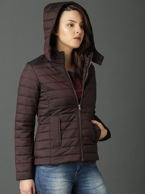 Burgundy solid padded jacket, has a hooded, three pockets, zip closure, long sleeves, straight hem, polyester lining
