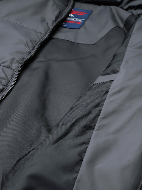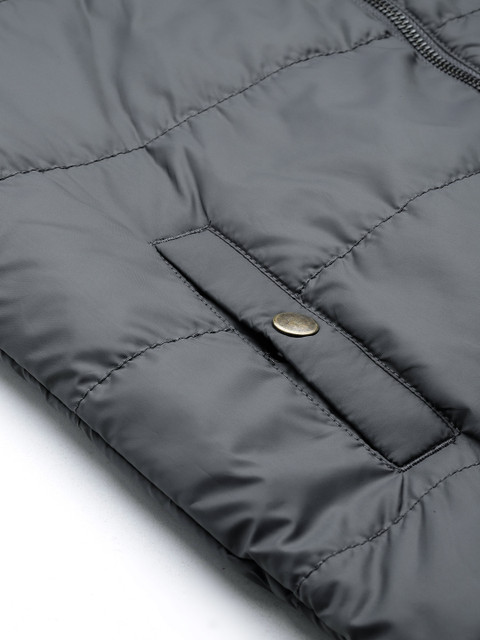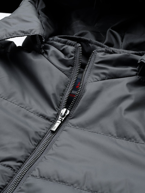 Charcoal solid puffer jacket, has a hooded, 2 pockets ,has a zip closure, long sleeves, straight hemline, polyester lining