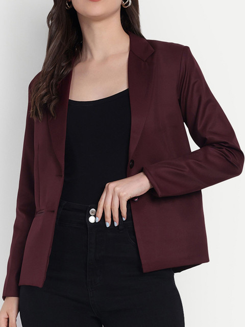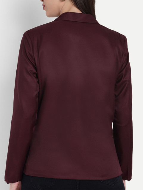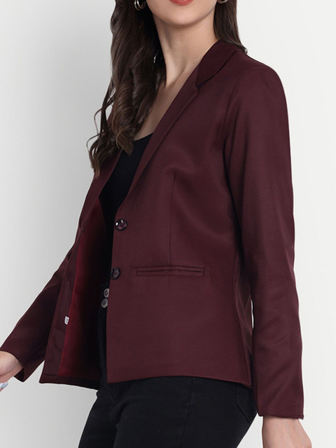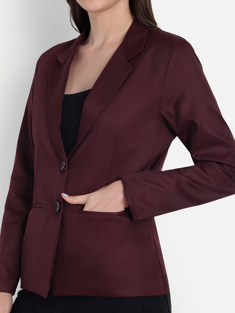 Maroon solid regular-fit casual blazer, has a notched lapel, long sleeves, single-breasted with double button closure, two flap pockets, one welt pocket and a ventless back hem