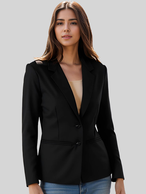 Black solid regular-fit casual blazer, has a notched lapel, long sleeves, single-breasted with double button closure, two flap pockets, one welt pocket and a ventless back hem