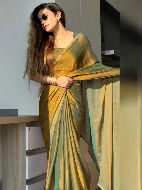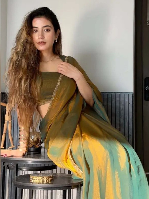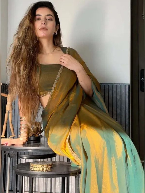 Pair this elegant two-tone chiffon saree with statement jewelry and high heels for a timeless festive look, or keep it minimal with delicate accessories for a graceful party-ready style.