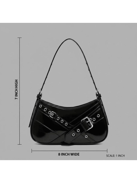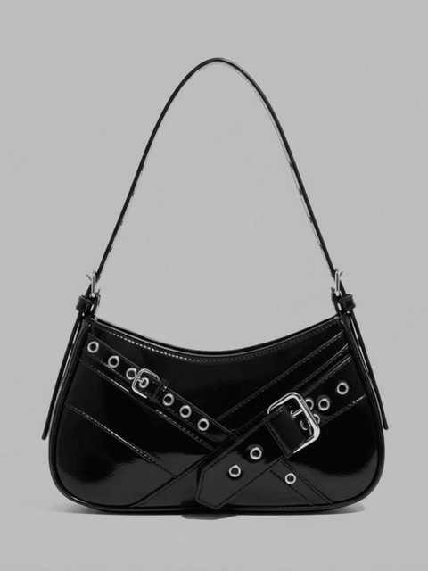 Black solid handheld bag, with buckle detail detail