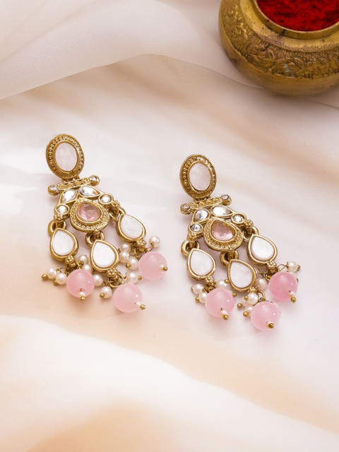 Gold-toned, pink and white teardrop shaped drop earrings, has cubic zirconia and kundan studded and beaded details