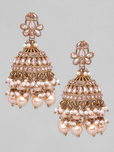 Gold-toned and pink dome shaped jhumkas, gold-plated, has American diamond and beads