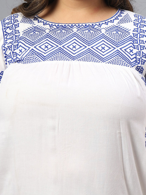- White and blue geometric embroidered a-line dress