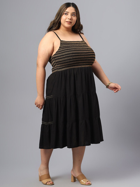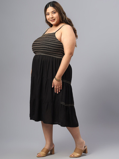 - Black and beige striped fit and flare dress