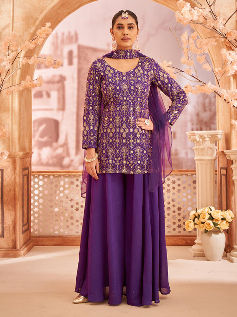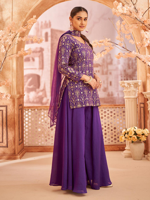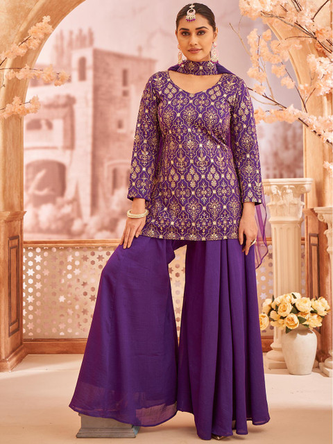 The kurta is beautifully crafted with rich golden motifs on a deep purple base.The sharara complements the kurta perfectly with its graceful fall and coordinated design.The dupatta is lightweight and flowy.Together, the kurta, sharara, and dupatta create a complete, well-balanced set ideal for weddings and festive occasions.