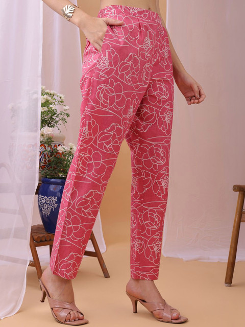 Pink & white printed mid-rise trousers, has an elasticated waistband