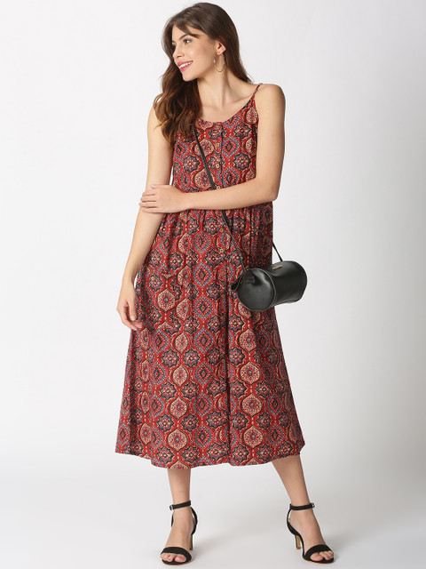 - Brick Red ethnic motifs print a-line dress