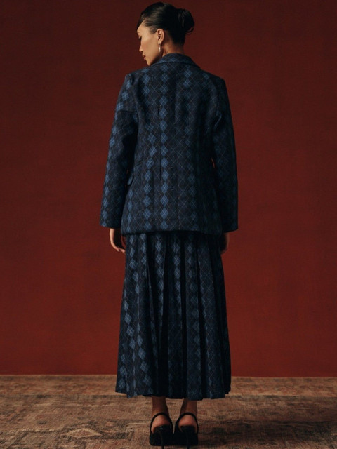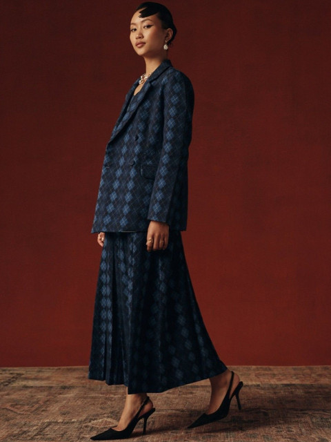 Blue printed comfort-fit casual blazer, has a notched lapel, long sleeves, single-breasted with double button closure, two flap pockets and a single-vented back hem