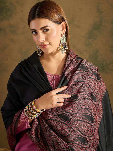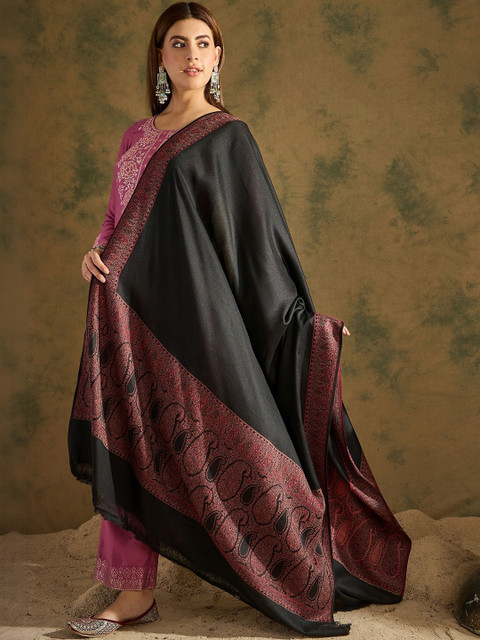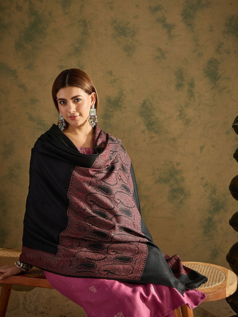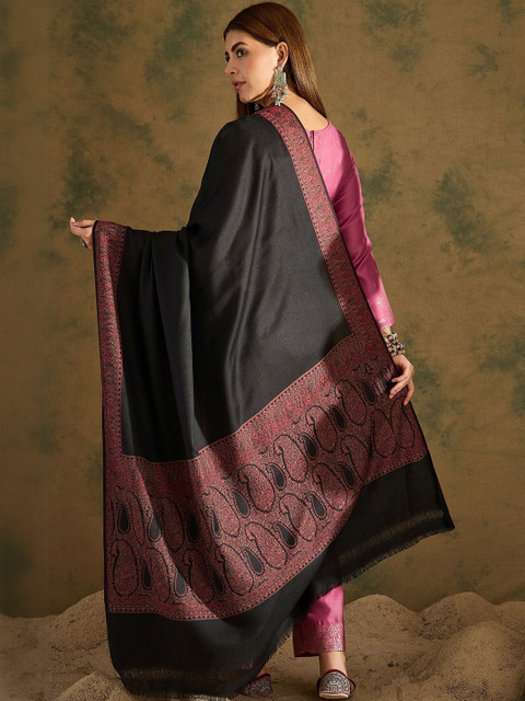 Black ethnic motifs woven design woollen shawl has a fringed border