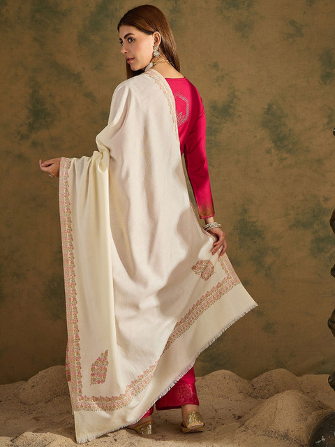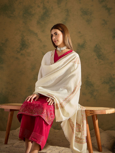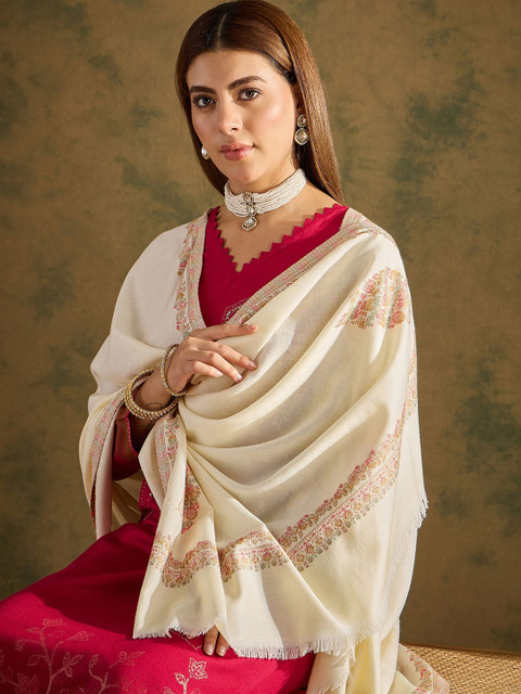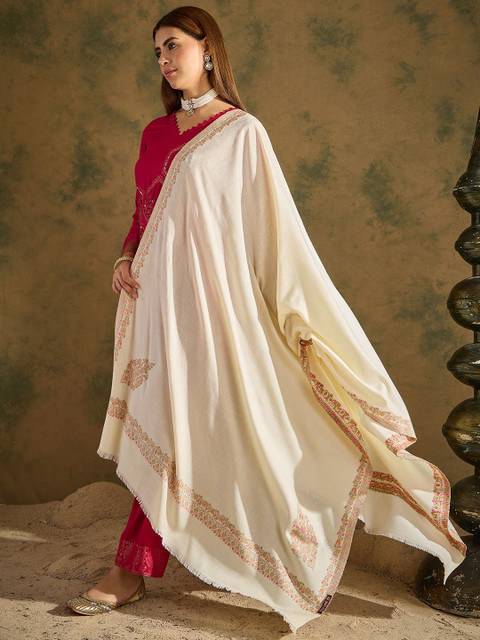 Off white, red and green ethnic motifs woven design pashmina shawl has a fringed border