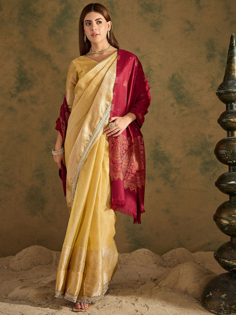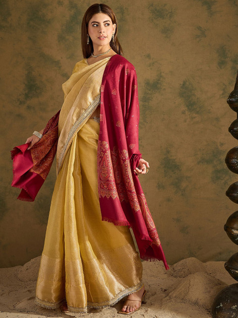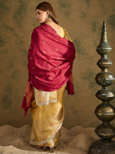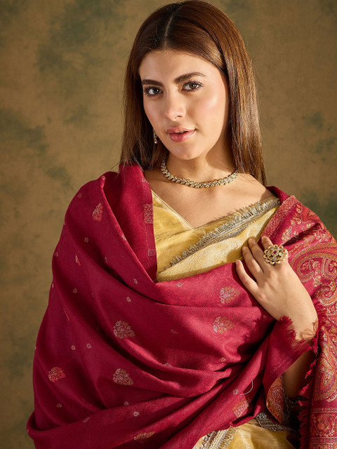 Maroon, green and yellow paisley woven design acrylic shawl has a fringed border