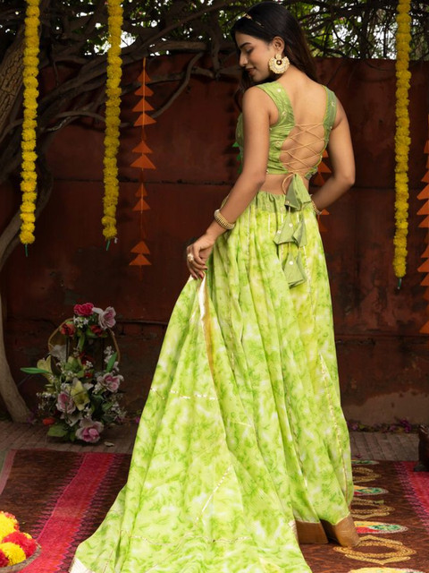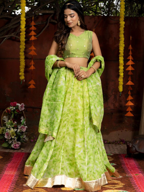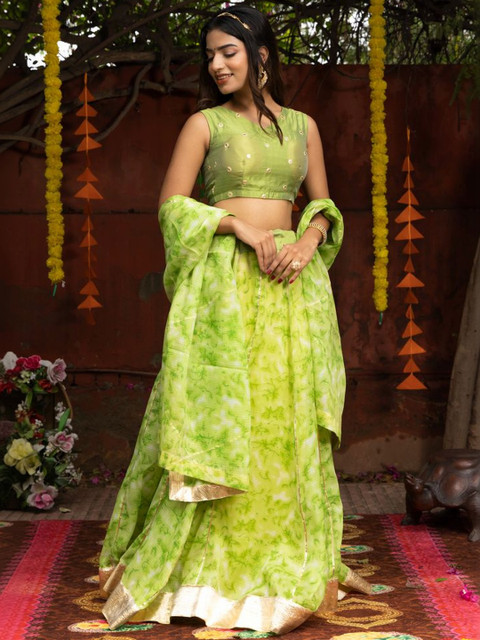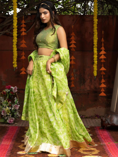 Lime green embellished lehenga choli with dupatta, has tie and dye technique and sequinned