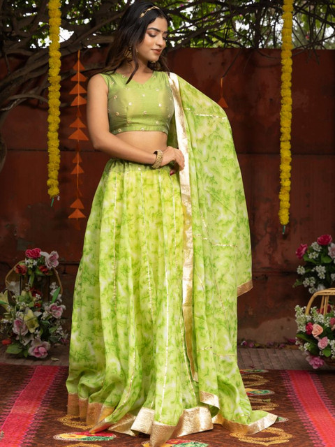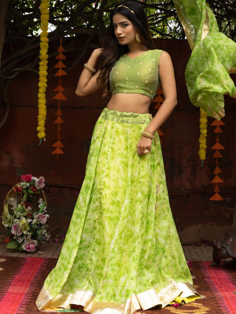 Lime green embellished ready to wear blouse, has a round neck, sleeveless, lime green printed ready to wear lehenga, flared hem