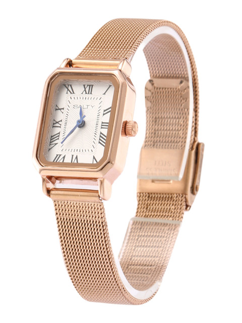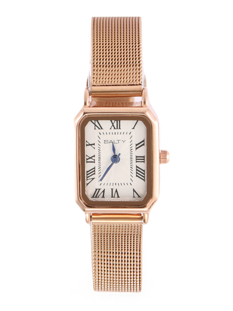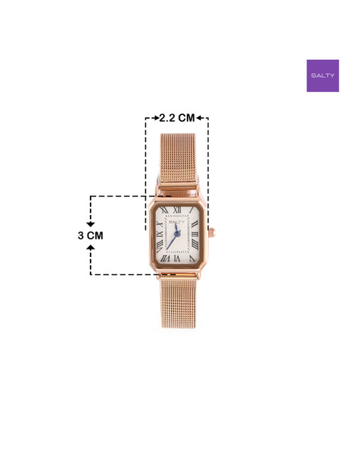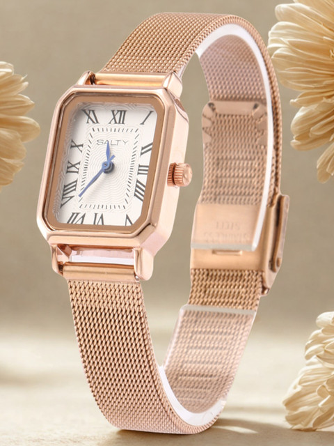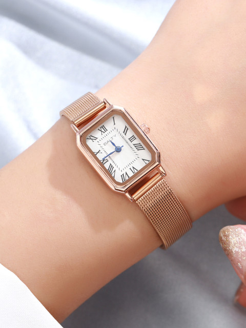 Strap Style: rose gold toned, bracelet style, stainless steel strap with a foldover
