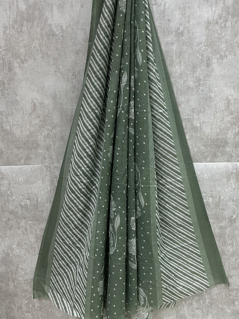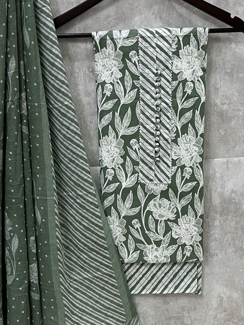 Green and white floral printed unstitched dress material
