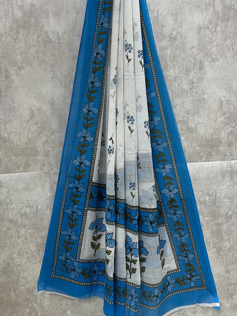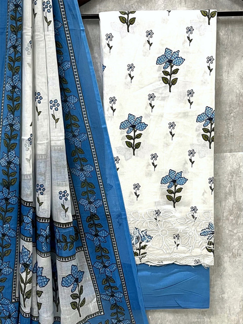 White and blue floral printed unstitched dress material
