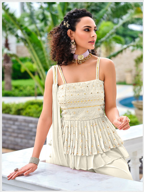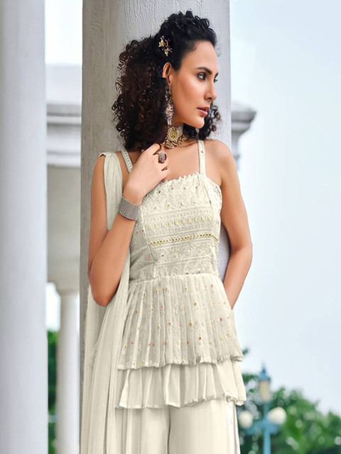 This co-ords set consists of a tunic and palazzos with dupatta. Cream and gold-toned embroidered tunic, shoulder strap neck, sleeveless. Cream solid palazzos, slip-on closure. Cream solid dupatta, has mirror work details.