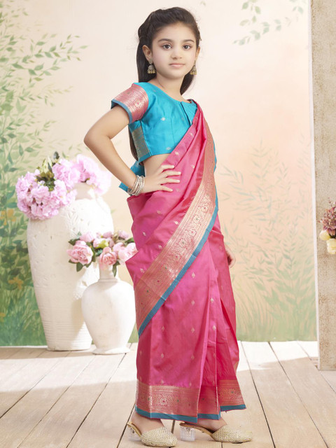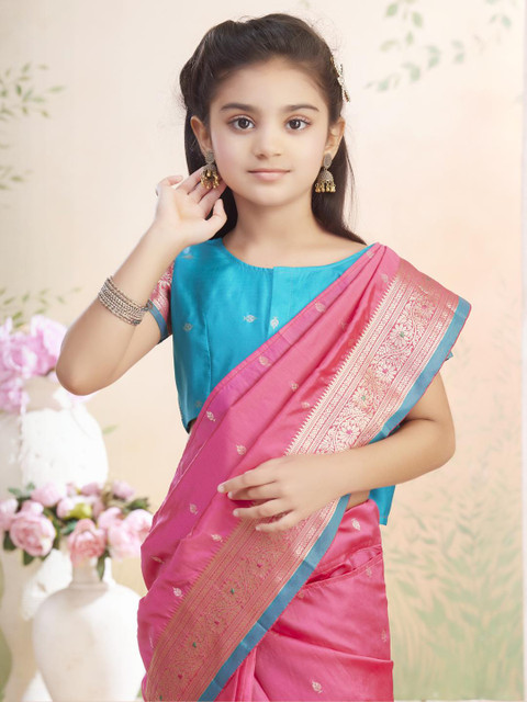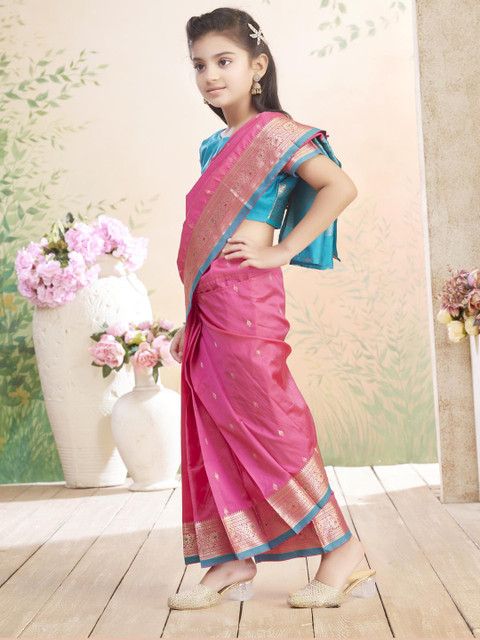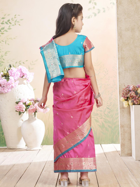 The model is wearing the stitched blouse that comes with the saree