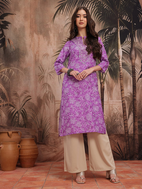 This kurta set is a must have in your closet. With the breezy silhouette and cheerful print and pattern, this kurta set will become your favourite go-to outfit. Top it off with mojaris or heels for an aesthetic look.