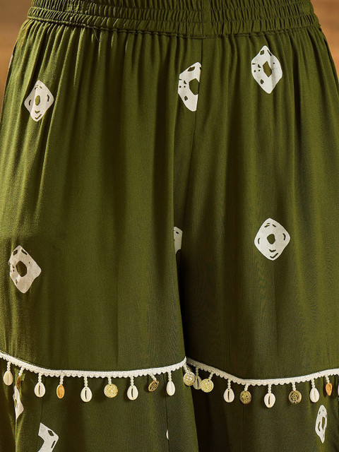 The white printed motifs and delicate tassel detailing around the kurta and dupatta add a classy, handcrafted touch. The fit is flattering and relaxed, and the flowy bottoms enhance the overall look. It drapes beautifully and gives a graceful traditional vibe without being too heavy.