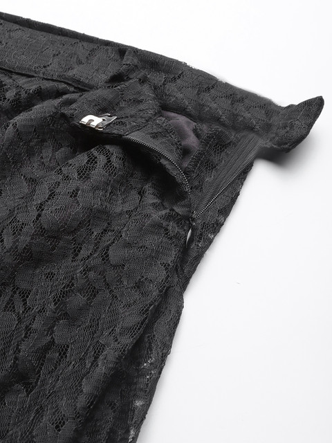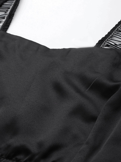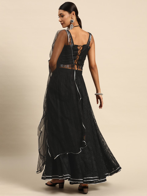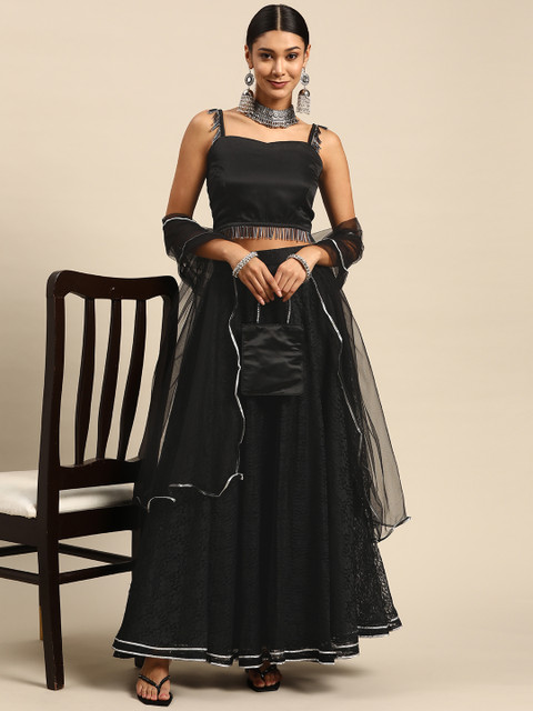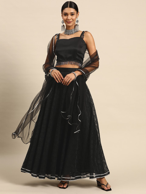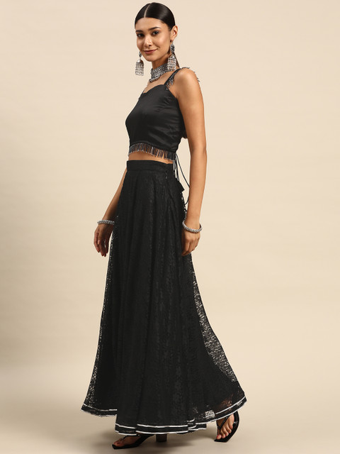 Black solid unstitched blouse, sleeveless, black woven design semi-stitched lehenga, has zip closure, flared hem