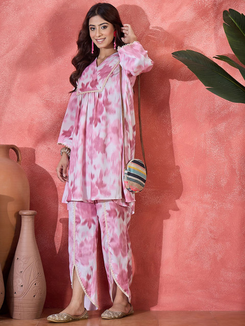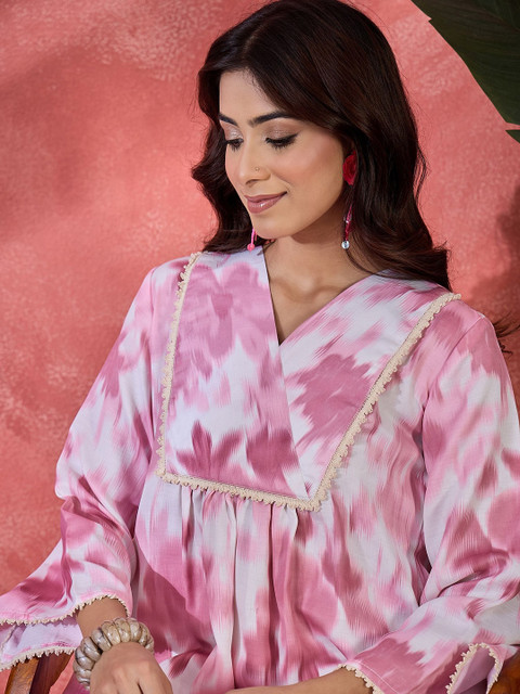 Pink and cream-colored digital printed tunic, has a V neck, and three-quarter sleeves, secured with slip on closure