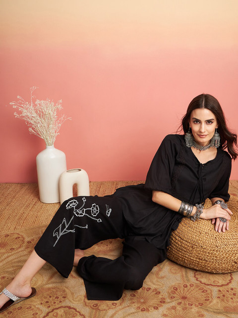 I recently purchased a black plazo with delicate white floral prints that truly elevate the whole look. Paired with a gathered top, this outfit is effortlessly chic. The white flowers beautifully highlight the black base, making the entire ensemble pop in the best way. I feel absolutely stunning every time I wear it! The fit is comfortable and flattering, perfect for both casual outings and more dressed-up occasions. A perfect mix of style and comfort!