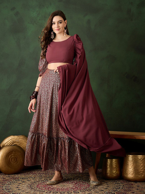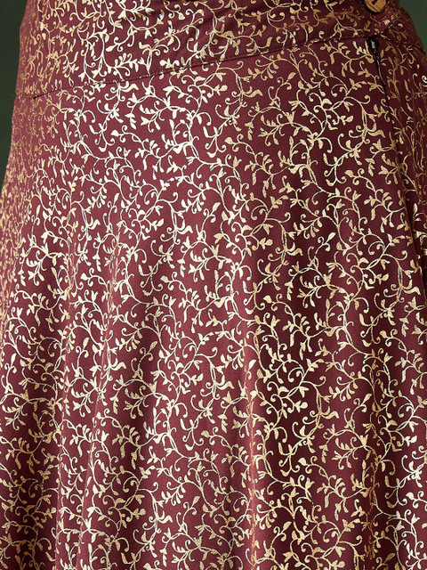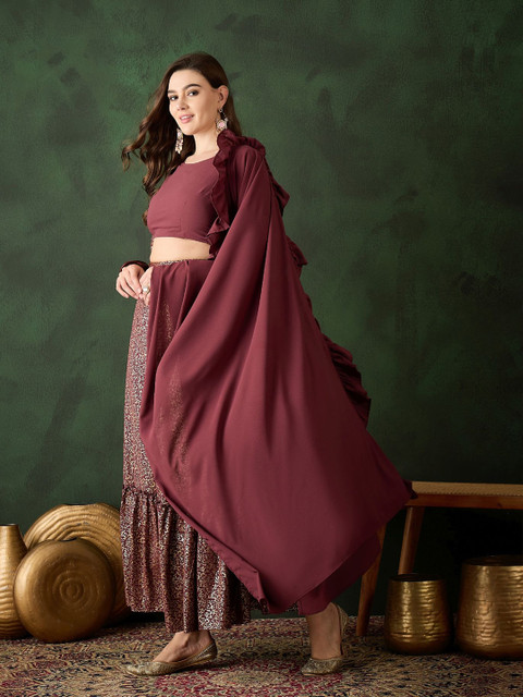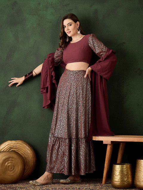 Burgundy colored embellished lehenga, has drawstring closure and flared hem